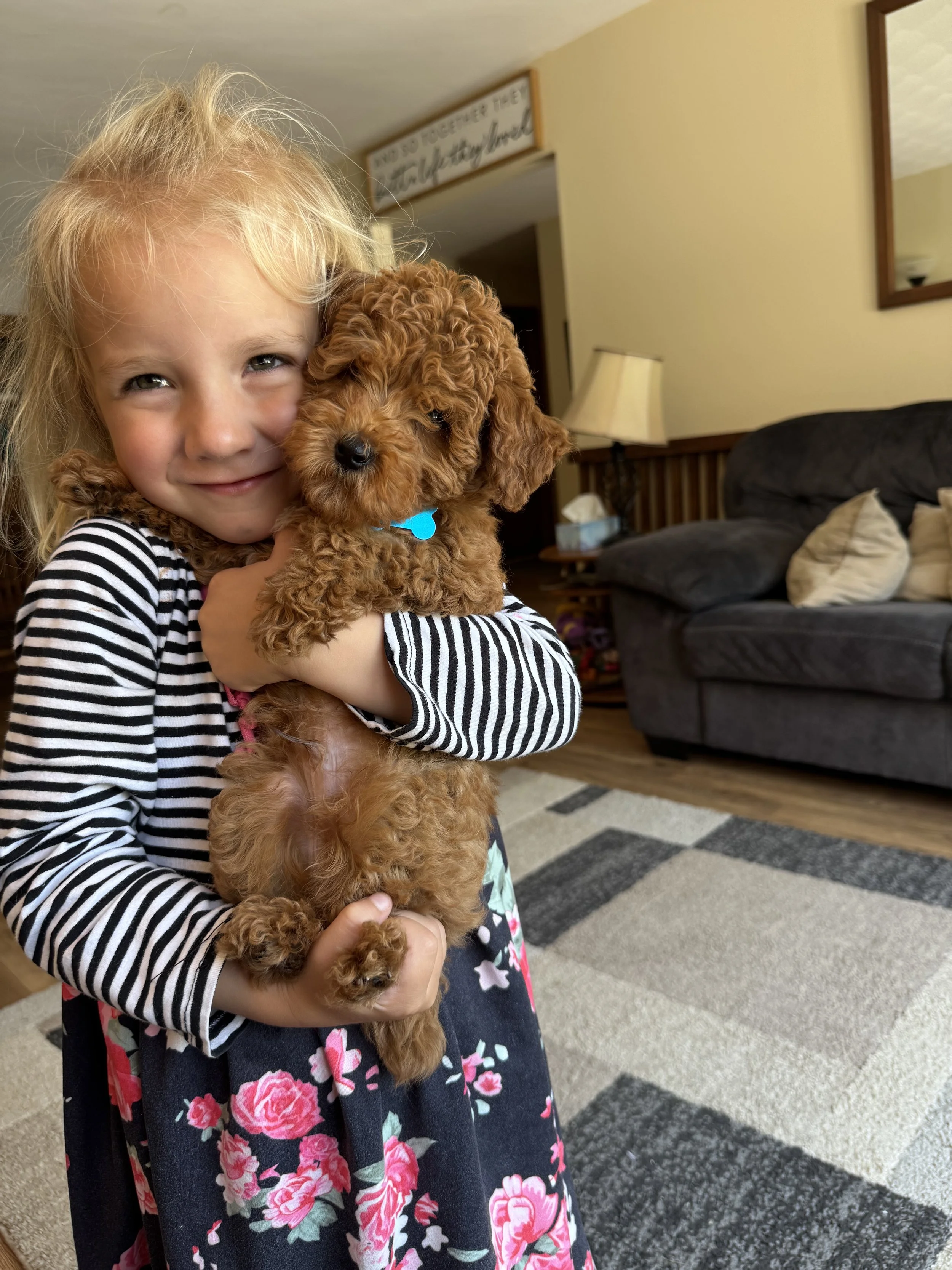 We expect our puppies to mature to be 10-15” tall at the shoulder. We expect red, apricot, cream, or black with the possibility of some small white markings. Please be aware that red and apricot poodles carry the fading gene and may fade to be a lighter color as they mature.